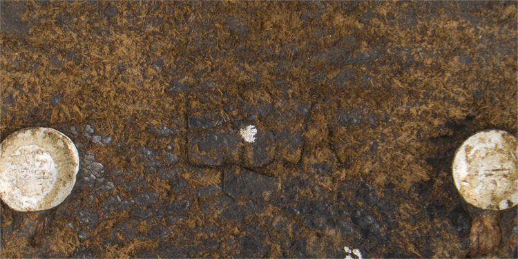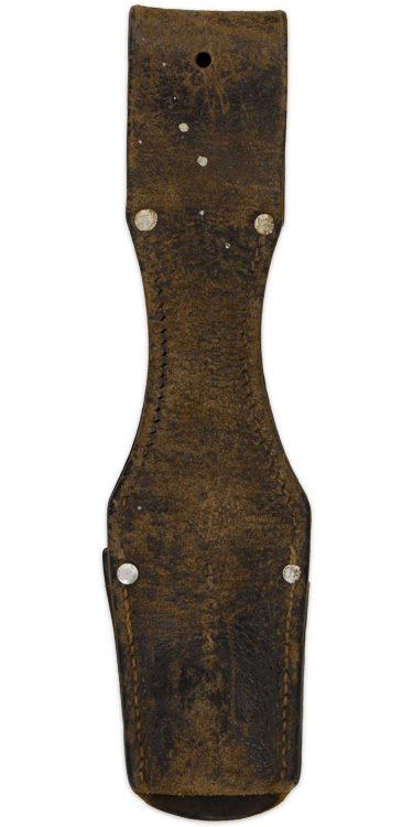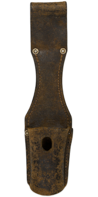 PHYSICAL DESCRIPTION: Early pattern, blackened leather construction K98 bayonet frog for issue to all unmounted personnel. The frog consists of a roughly, 24cm tall, 57mm wide at its widest point and 34mm, wide at its narrowest point, dual layered, hour glass shaped leather panels with a belt loop to the top edge and a stitched on bayonet pocket to the bottom edge of the obverse. The base of the frog has a row of stitching near each outside edge with aluminum reinforcement rivets positioned on either side at the bottom edge of the belt loop and an additional rivet to each side of the reverse top edge of the bayonet pocket. The frog also an additional, short, row of stitching running vertically down the center of both the obverse and reverse panels. The bayonet pocket is stitched down sides with a central vertically oval front lug hole. The reverse of the frog has a faint makers mark, but too hard to read. Frog is LBA (Luftwaffe) marked. The frog is in a very worn and used condition and one of the side pocket rivets has pulled loose. Would work well with a similar condition bayonet. Nice salty example.