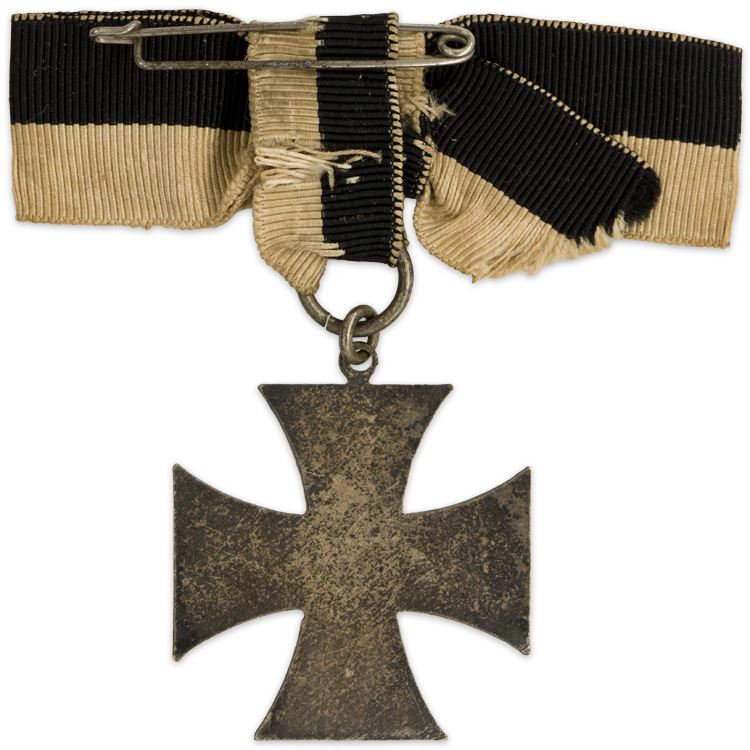 A light weight, metal alloy medal measuring approximately 3.5cm square suspended from a black and white striped silk ribbon tied into a bow. A safety pin is to the reverse. The bow has become a bit fragile, as the small section that the medallion is suspended from has partially torn.
