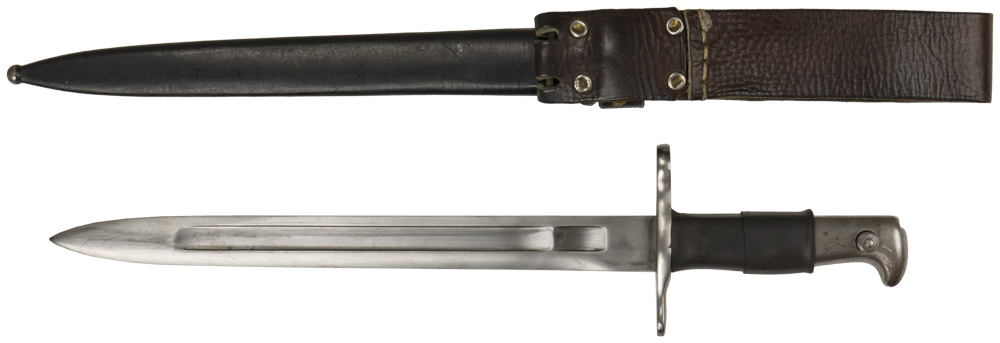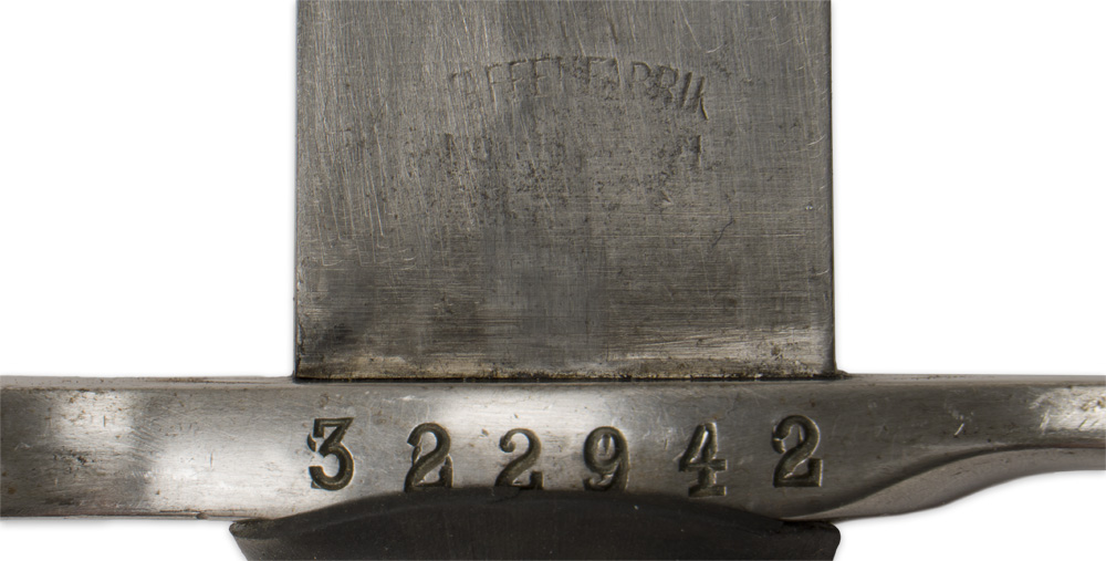 A 42cm long bayonet (in overall length) with a 30cm long bright blade that is faintly marked "Waffenfabrik" and is nicely marked with the serial number "322942" as well as a Swiss cross marking. The release button is in good working order. The pommel has a black rubber sleeve. Included is a black painted scabbard that also bears a Swiss cross to the ball tip and a leather rivetted frog.