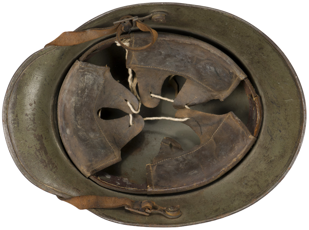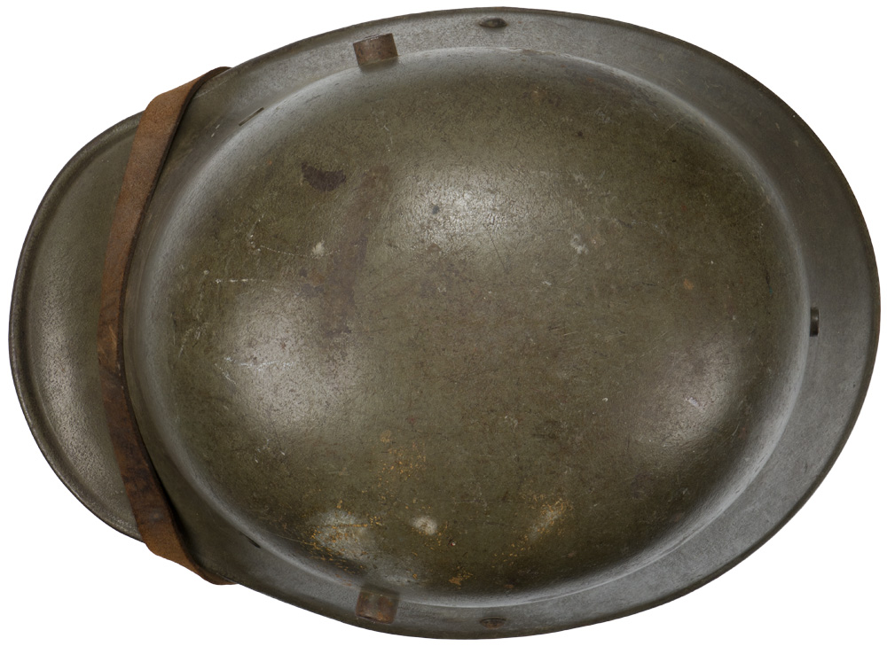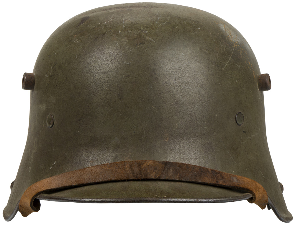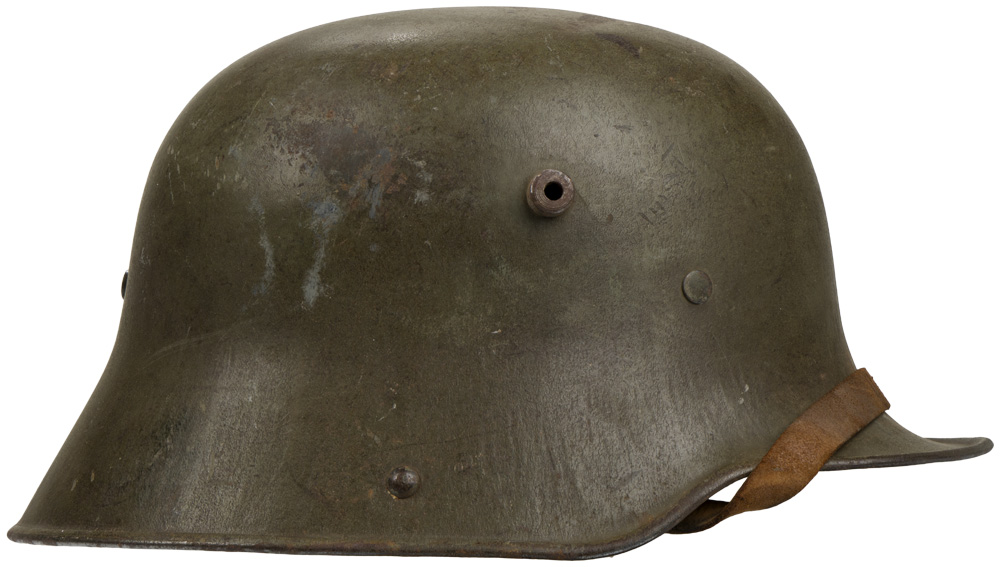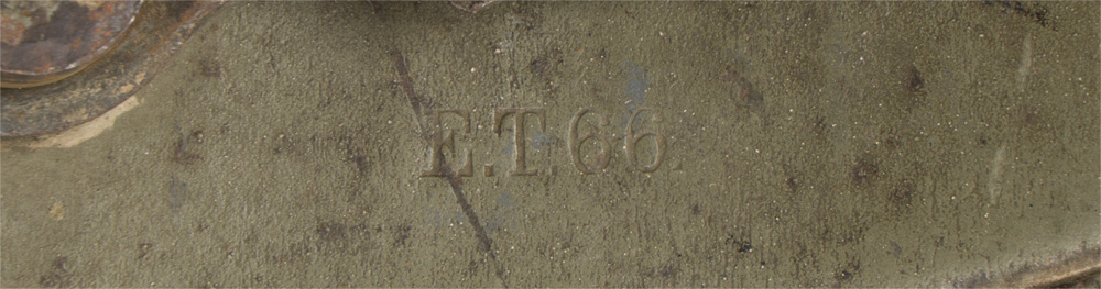 PHYSICAL DESCRIPTION: The stamped, sheet steel construction, helmet retains a good portion of its original paint. The helmet has both the dome headed chinstrap retaining rivets, both of the extended ventilation side lugs and all three of the flat headed liner retaining rivets. The interior of the helmet has a pre May 1917 pattern leather liner band complete with the original pads. Padding is complete in all the bags. Left side apron has a deeply stamped manufactures code and size, "E.T. 66", indicating manufacture by Eisen und Hüttenwerke, AG Thale/Harz size 66. Original chinstrap is present. Nice untouched helmet.