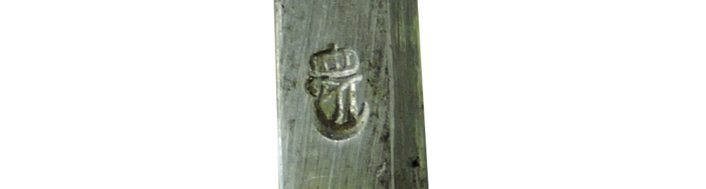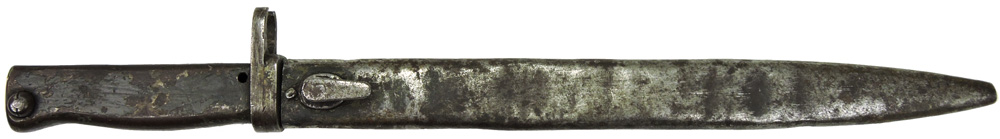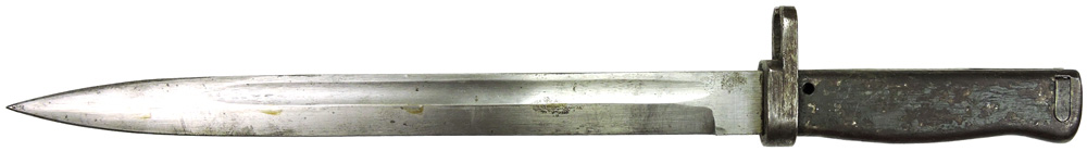 . (Seitengewehr)An "ersatz" (substitute) bayonet and its scabbard, made in answer to shortages by a machine shop from stamped or cast parts. The unsheathed bayonet has an overall length of 44cm. The bayonet’s steel hilt has a stud guide and locking stud. The steel cross guard has an open-topped muzzle ring extending from its top. Both the hilt and cross guard appear to have been painted olive drab at some point, less than 30% of which remains. The 31.5cm blade, which is 26mm wide near the guard, has wide fullers along most of its length, and comes to a point with a swedge. A crowned letter "T" is stamped to the back of the blade near the ricasso. Scabbard runner marks and light surface scratching is evident to the polished blade. Its sheet steel scabbard has a throat screw and a raised frog lug near its mouth, and tapers along its 33cm length. The scabbard is heavily surface spotted, and has numerous indentations to it.