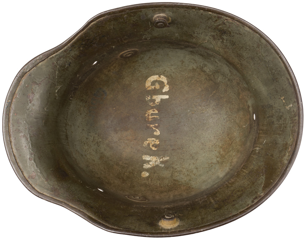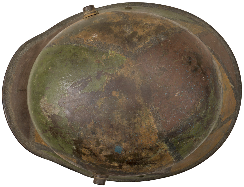 PHYSICAL DESCRIPTION: The stamped, sheet steel construction, helmet retains a good portion of its hand painted camouflage. The camouflage paint is in shades of dark green and red in a random patch pattern with the colors being separated by black stripes. Liner is now missing. Shell is marked "BF62" for F.C. Bellinger, Fulda. (Size 62). Nice untouched original camo.