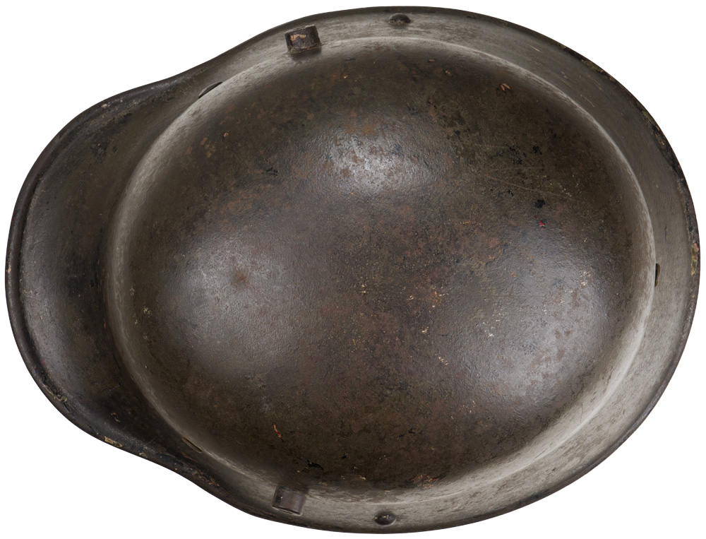 PHYSICAL DESCRIPTION: The stamped, sheet steel construction, helmet retains looks like it had camo at one time or some other type on overpaint? This can be seen around the inside apron as well. The helmet has both the dome headed chinstrap retaining rivets, both of the extended ventilation side lugs and all three of the flat headed liner retaining rivets. The interior of the helmet has a pre-May 1917 pattern leather liner. Liner pins are replaced. The pads (tips on one of the pads is broken) and stuffing are present, but have been restored to the helmet as it seems a bit too small. Size adjustment string is replaced. No size or maker marks visible because of the overpaint.