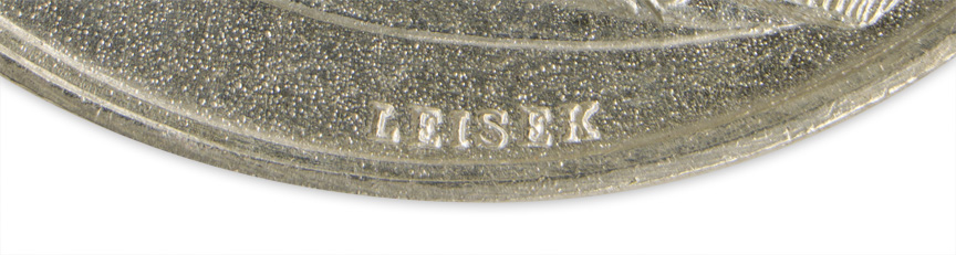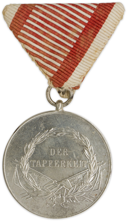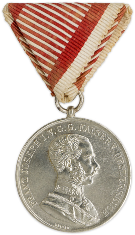 A Type VII (Franz Joseph I 1914-1917) silver medal cut by engraver Friedrich Leisek" measuring approximately 40mm in diameter that shows the right facing profile of Franz Joseph I with the name "Leisek" visible just below the bust. The reverse bears the words "DER TAPFERKEIT" or "For Bravery". The medal is suspended from the original, tri-fold ribbed silk ribbon.