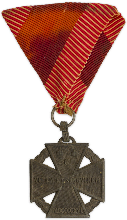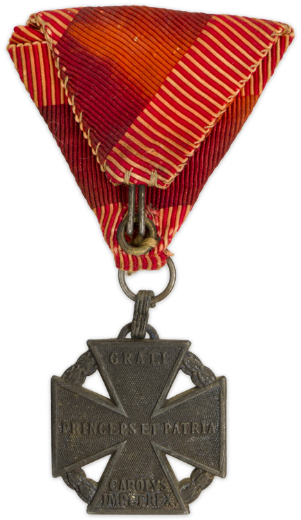 Instituted on December 13, 1916 by Emperor Karl I of Austria/Hungary and awarded for a minimum of twelve weeks of service, regardless of rank, that had served at the front. There were 651,000 awarded. The pateé cross with laurel wreath, is marked to the front with an Austrian and Hungarian crown above the letter "C" (Carolus), along with the words "Vitam Et Sangvinem" (With Life and Blood) and date MDCCCXVI (1916). The opposite side has the words "Grati Princeps et Patria, Carolvs Im. Et. Rex" (A Grateful Prince and Country, Karl, Emperor and King). It is suspended by a ring on an alternate red and white striped silk ribbon of which, the colours have bled into one another. Of Note: This medal’s design is based on the the ‘Cannon Cross’ – ‘Kanonenkreuz’ of 1813-1814.