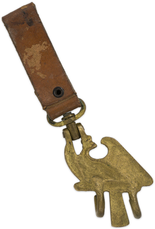 A cast brass drum hanger roughly 50mm at widest point, and 85mm tall, hung from its leather belt loop from a swiveling brass mount. The hanger itself is in the from of a right-facing crowned eagle perched on a horizontal bar from which descend the two hooks for the drum.