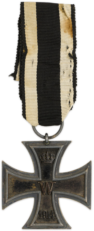 PHYSICAL DESCRIPTION: 1914 pattern, die struck, three piece, iron and alloy construction Pattée style cross with a single piece iron core and two piece silver alloy frame. The obverse of the cross features an embossed, central, "W" cypher for King Wilhelm II, re-institution date, "1914", to the bottom arm and a King’s crown to the top arm. The reverse of the cross features an embossed, central, oak-leaf cluster, with the "FW" cypher for King Friedrich Wilhelm III, a King’s crown to the top arm and the original institution date, "1813", to the bottom arm. All the emblems are in nice high relief. The ribbon suspension loop and ring are both intact. Unmarked. Complete with ribbon.