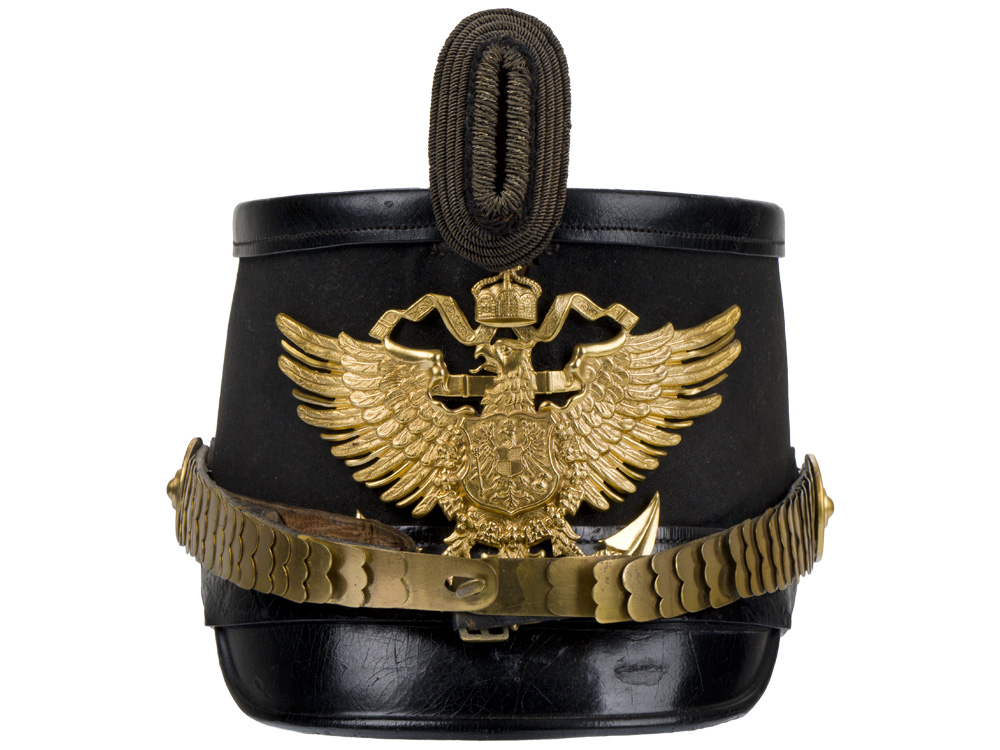 Imperial German Sea Battalion (Marine Corps) Officer’s Shako. Beautiful textbook example of the officer’s shako (brushed black felt body for officers, black leather for enlisted). Perfect original condition. Three labels inside. In the top of the dome behind the officers silk lining is the partially readable makers label in a green circle. Also present are an old museum label (a white rectangle with a blue border) and the collection inventory label from the famous Norm Hobson collection (the number 195 in ink on a white rectangle with a red border.) All of the imperial headgear in the legendary Norm Hobson collection had a label of this description, giving this shako extraordinary provenance and desirability. Officer’s liner in excellent condition but a little soiled. With rare original officer’s Feldzeichen in the slot above the fire gilded See Bataillon eagle.