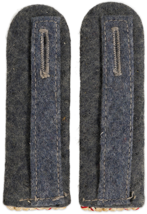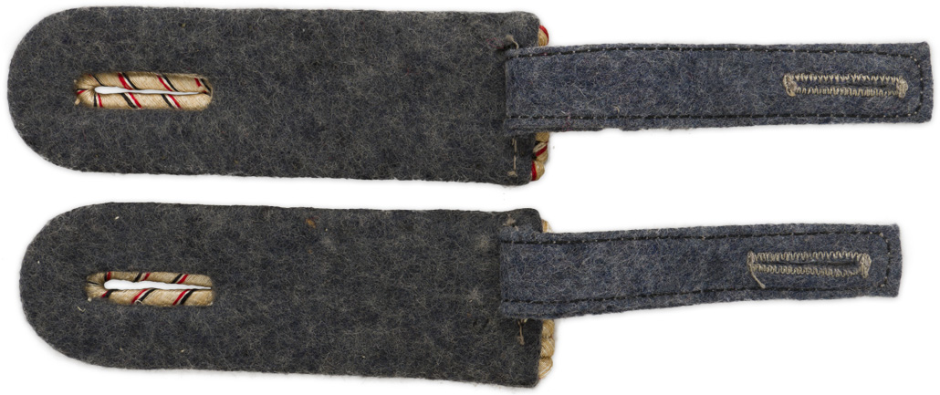 Slip on shoulder boards of matte silver/aluminum braid with evenly spaced "V"s in the national tri-colors of black, white and red, with blue/grey wool waffenfarbe. Boards are in good condition but one has a couple of moth nips to blue/grey wool waffenfarbe resulting in the cardboard underlay being visible. Boards signify the Sonderführer position of Zugführer, equivalent to the rank of Leutnant. Scarce shoulder boards.