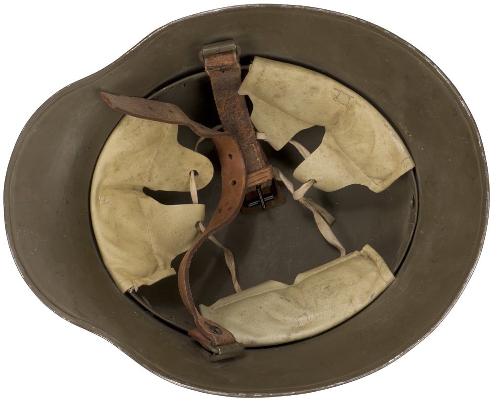 PHYSICAL DESCRIPTION: The stamped, sheet steel construction, helmet retains most of its original green/feldgrau paint. The helmet has both the dome headed chinstrap retaining rivets, both of the extended ventilation side lugs and all three of the liner retaining rivets. The interior of the helmet has a three pad leather liner with steel retaining band intact. All three leather pads are present. All three still have their original horse hair stuffing. Could not find any visible markings, although they are most probably there someplace. Nice large size, 68 or 70!
