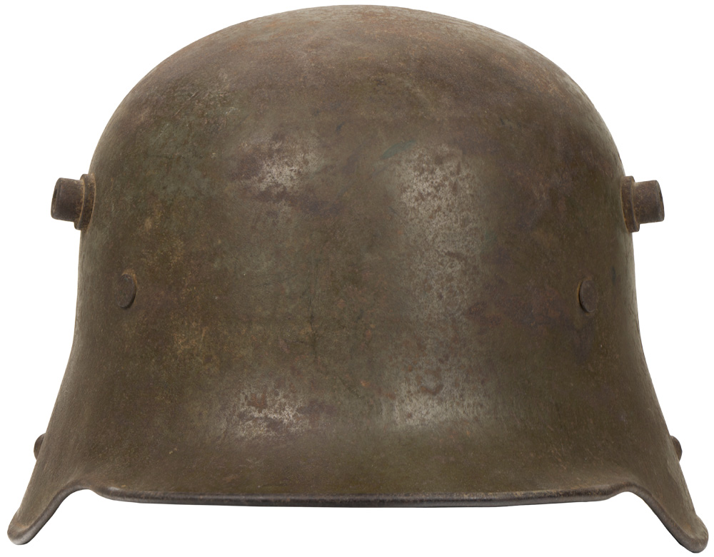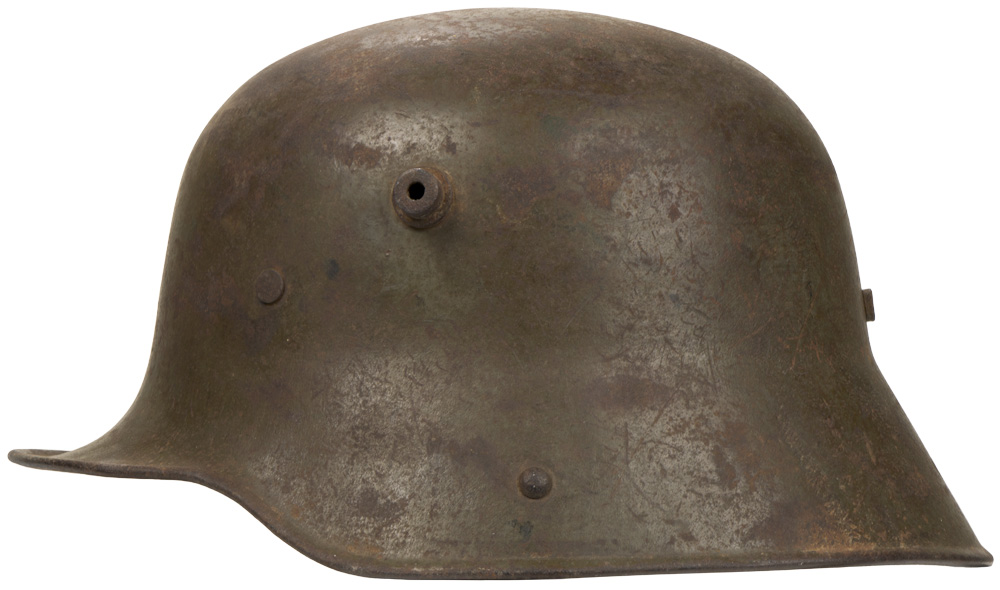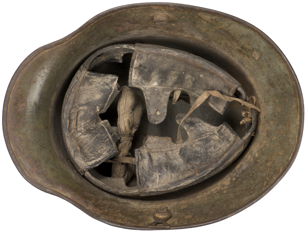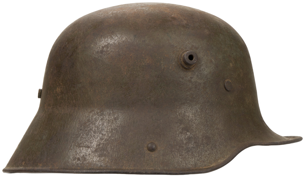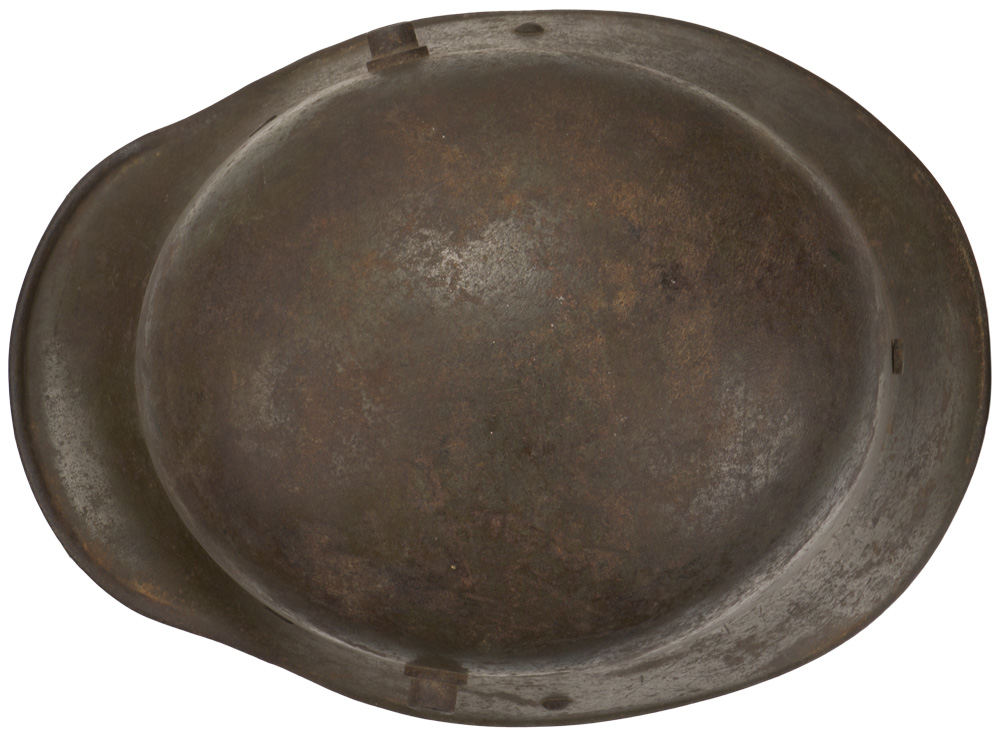 PHYSICAL DESCRIPTION: The stamped, sheet steel construction, helmet retains a good portion of its original paint with a nice overall salty patina. The helmet has both the dome headed chinstrap retaining rivets, both of the extended ventilation side lugs and all three of the flat headed liner retaining rivets. The interior of the helmet has a pre May 1917 pattern leather liner band complete with the original pads. One padding bag remains. Liner has come unstitched at the back seam. One chinstrap M98 attachment is still present. Apron is stamped with the faint, manufacturer’s code and size "ET 64" indicating manufacture by Eisen und Hüttenwerke, AG Thale/Harz, size 64. Nice untouched helmet.