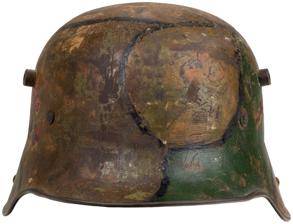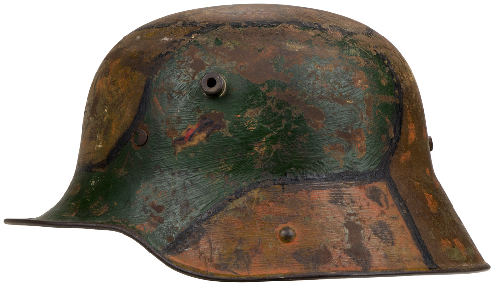 BACKGROUND: The first "modern" steel helmets were introduced by the French army in early 1915 and were shortly followed by the British army later that year. With plans on the drawing board, experimental helmets in the field, ("Gaede" helmet), and some captured French and British helmets the German army began tests for their own steel helmet at the Kummersdorf Proving Grounds in November, and in the field in December 1915. An acceptable pattern was developed and approved and production began at Eisen-und Hüttenwerke, AG Thale/Harz, in the spring of 1916. These first modern M16 helmets evolved into the M18 helmets by the end of WWI. The M16 and M18 helmets remained in usage through-out the Weimar Reichswehr era and on into the early years of the Third Reich until the development of the smaller, lighter M35 style helmet in June 1935. Of Note: In July 1918 Chief of the General Staff of the Field Army, Erich Ludendorff issued a directive which clearly laid out the camouflage colors and pattern that was to be applied to all helmets in the field. The directive also included the amounts of paint that 1,000 helmets would require as five kilograms, (11Lbs), each of, green, ochre yellow and rust brown, and two kilograms, (4.4 Lbs), of black paint.