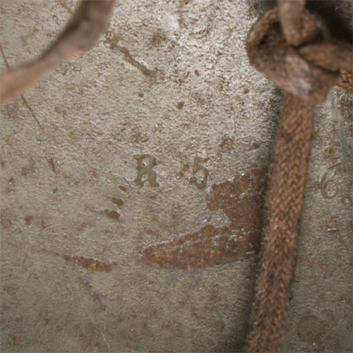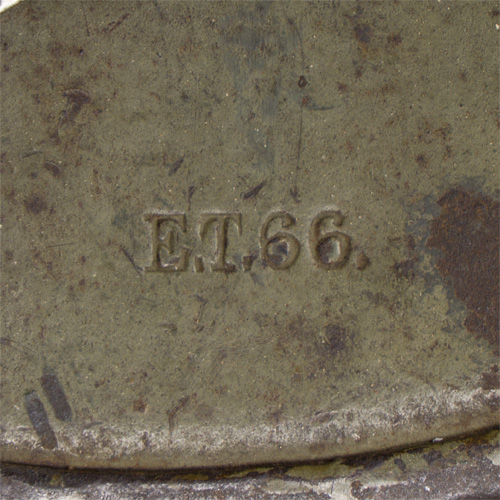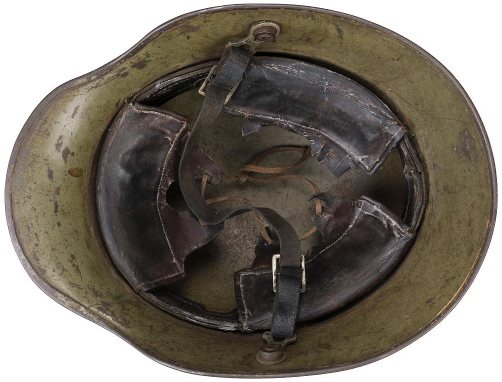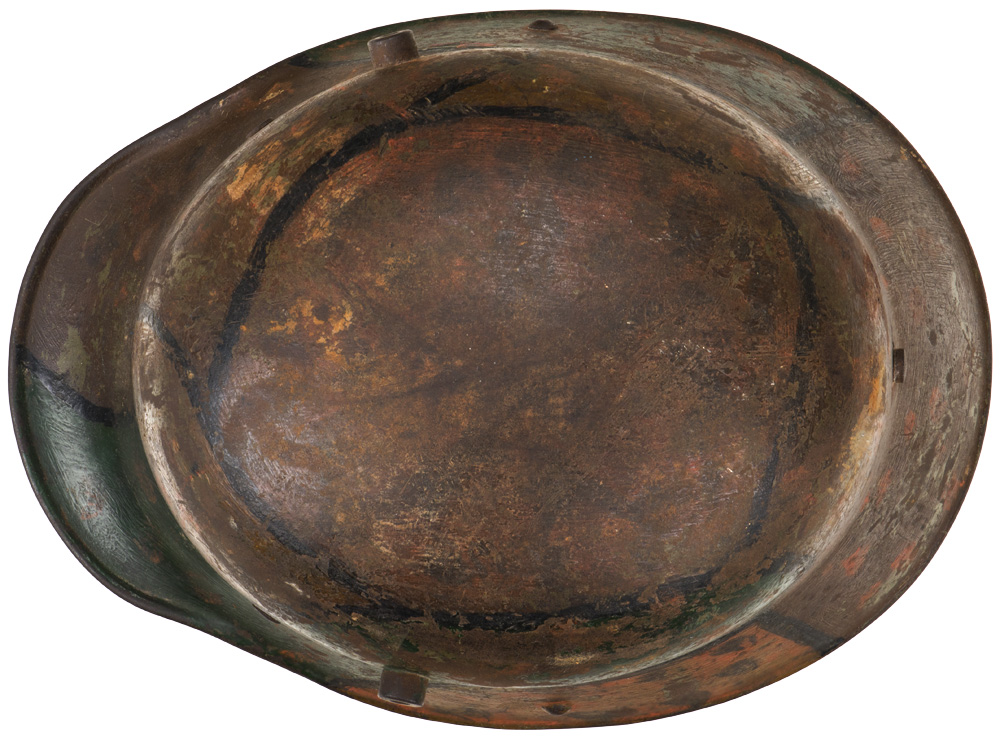 PHYSICAL DESCRIPTION: The stamped, sheet steel construction, helmet retains a good portion of its hand painted camouflage. The camouflage paint is in shades of dark green and red in a random patch pattern with the colors being separated by black stripes. The helmet has both the dome headed chinstrap retaining rivets, both of the extended ventilation side lugs and all three of the flat headed liner retaining rivets. The interior of the helmet has a pre-May 1917 pattern, three pad leather liner with leather retaining band intact. All three leather pads are complete and still have their original horse hair stuffing. Tips on one of the liner pad string holes are torn. Original chinstrap. Stamped manufactures code and size, "E.T. 66", indicating manufacture by Eisen-und Hüttenwerke, AG Thale/Harz size 66. On the right side of the helmet is a partial remaining decal/label the would have said "WÄHLT HITLER" (Elect Hitler). Very interesting example!