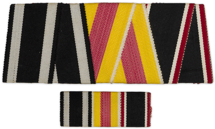 A pair of matching ribbon bars that represent the Iron Cross 2nd Class, the Baden Service Medal and the 1914 Cross of Honour. Each bears an original hinged pin.