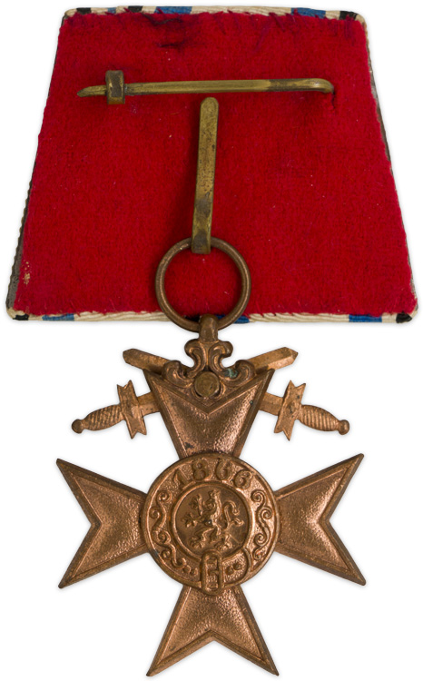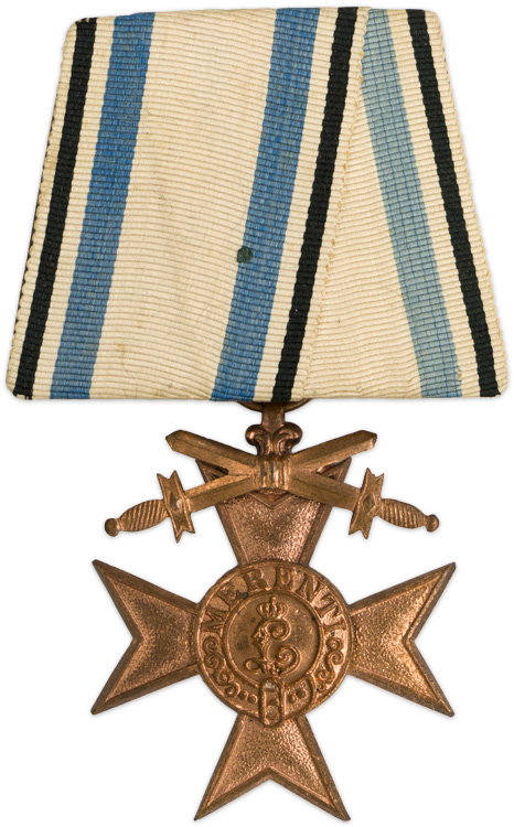 PHYSICAL DESCRIPTION. A Maltese cross with a center medallion with an "L" cypher of King Ludwig II with "Merenti" on the ring. The reverse has a Bavarian lion with "1866" (the date of founding) above. The arms of the Maltese cross are bronze with crossed swords. The medal measures approximately 7cm x 4cm. Nice single parade mount.
