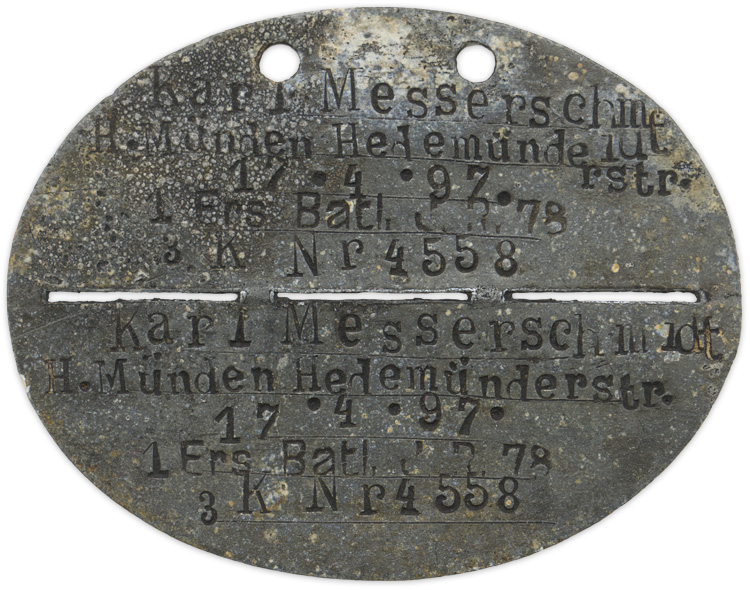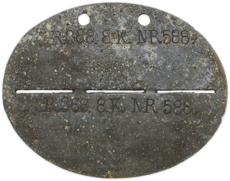 Roughly 70mm long by 55mm wide, stamped zinc ID tag. Two holes to top section and one to bottom for securing cord. Tag is marked to a member of “Ers. Batl. J.R. 78".