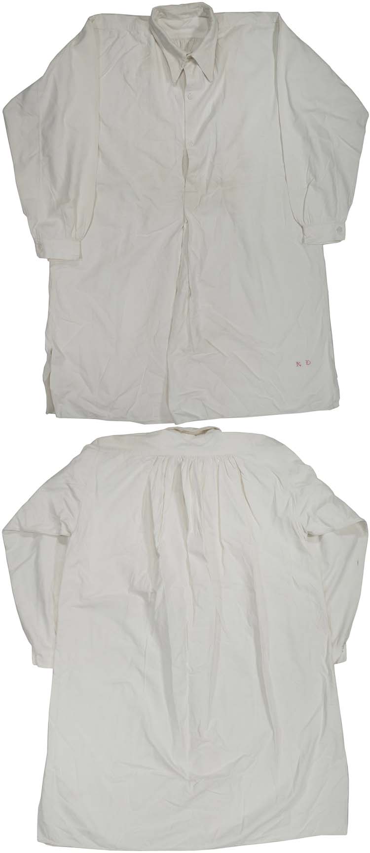 (Hemd)Private purchase, pre 1918 period. A three-quarter length, long-sleeved, white linen shirt. All buttons complete and original stitching. Original owners initial are hand stitched to the shirt. Roughly a 44" chest. Excellent condition.