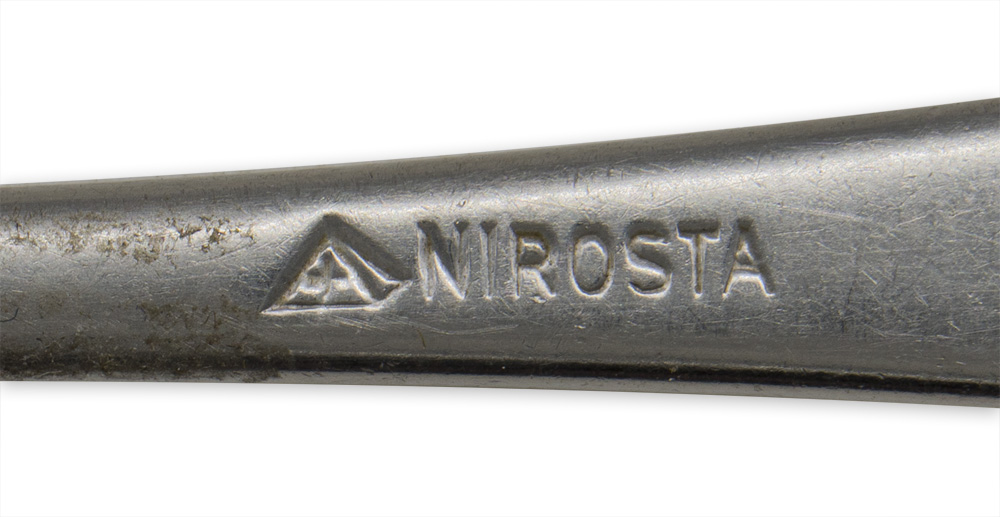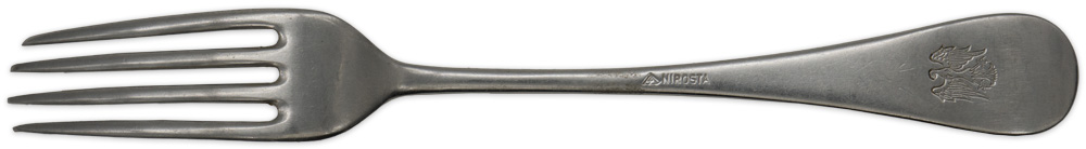 PHYSICAL DESCRIPTION: The single piece, german nickle/silver plated construction mess hall/galley four tine fork is roughly, 21cm long. The reverse is well marked with an impressed Imperial Eagle and the impressed manufacturer’s name "NIROSTA".