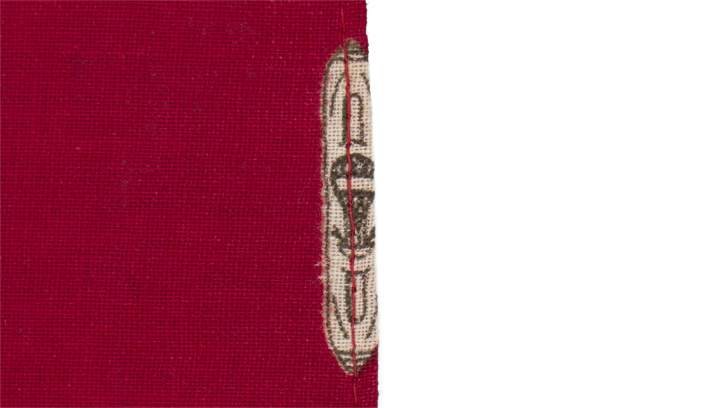 A printed, 61cm x 60cm, cotton, single sided table covering. There is a stain to the surface.