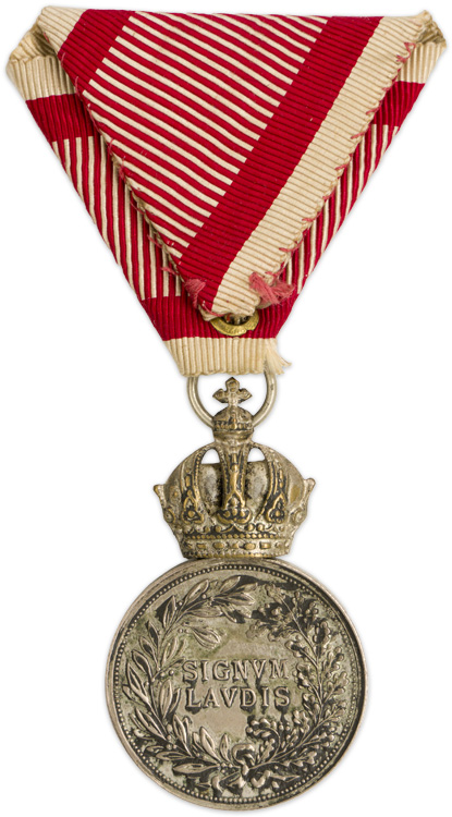 A 30mm diameter silver medallion showing the bust of the Franz Joseph I to the front, while the reverse reads "SIGNUM LAUDIS" (Latin for "Sign of Praise") surrounded by a wreath, half-laurels and half-oak leaves. The Medal is surmounted by a crown and a war time tri-fold ribbon.