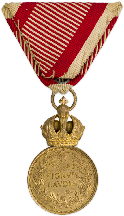 A 30mm diameter bronze medallion showing the bust of the Franz Joseph I to the front, while the reverse reads "SIGNUM LAUDIS" (Latin for "Sign of Praise") surrounded by a wreath, half-laurels and half-oak leaves. The Medal is surmounted by a crown and a war time tri-fold ribbon.