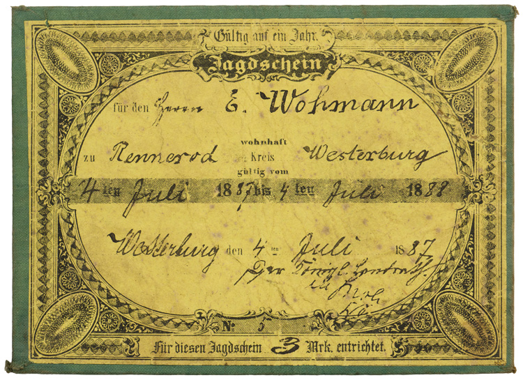 A 14cm x 10cm, double sided hunting licence dated for 1887-1888.