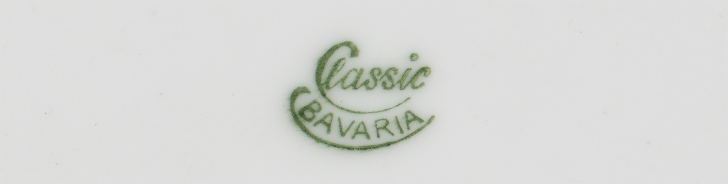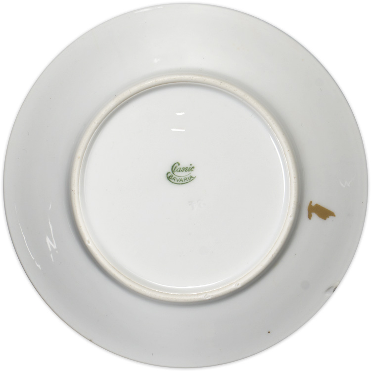A white porcelain saucer measuring approximately 15.5cm in diameter. To the bottom is marked under the glaze “Classic” and “Bavaria”.