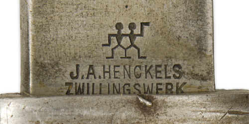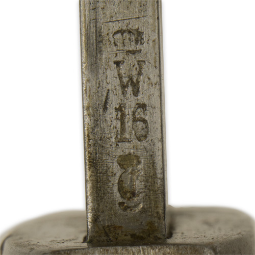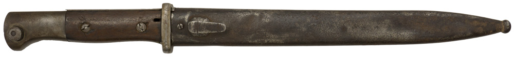 (Seitengewehr)A second pattern (the first were conversions of S 71/84 bayonets) model 1884/98 bayonet, introduced in 1915 as a short-blade wartime utility bayonet, and known as the S 84/98 nA ("Seitengewehr 84/98 neuer Art," or, Bayonet ‘84/‘98 new Pattern), with its original scabbard. Spine is nicely dated for 1915. Blade is 23cm. Scabbard is complete and in decent condition. Maker marked to "J.A. Henkels". Shows the expected age and use. The blade has been shortened, and ground on near the tip. One grip panel has been replaced with a lighter color home made piece of wood. Scarce.