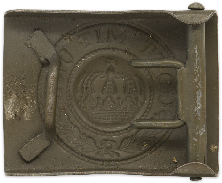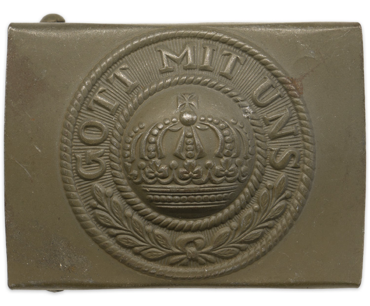 PHYSICAL DESCRIPTION: A one-piece construction wartime M1915 Prussian belt buckle, painted field grey, as was the practice after January of 1915. The slightly convex, stamped metal box buckle, features, against its plain, obverse field, a crown to its domed center, encompassed by a dual rope-like border within which, against a ribbed background, is "Gott Mit Uns" (God [is] With Us), and a spray of laurels. To the reverse is its raised buckle catch, and a metal prong bar with dual prongs, for the belt’s retaining tongue. Unmarked. Near mint.