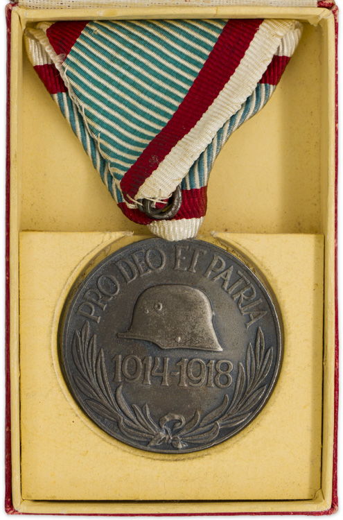 A 37mm diameter alloy medal. To the front is the coat of arms of Hungary, being St. Stephen’s crown atop a shield with horizontal bars to the left, and a double-armed cross, not unlike the cross of Lorraine, to the right. Swords cross diagonally behind the shield, and laurels arch along the left, and oak leaves along the right. To its reverse is a profiled M16 helmet, with "1914-1918" underneath it, a spray of laurels arching along the base, and "Pro Deo Et Patria" (For God And Country) arching along the top. A small ring surmounts the medal, through which is fed a larger ribbon suspension loop. Original ribbon is complete. Included is a two piece cardboard case with paper hinge that measures approximately 6cm x 9cm with gilt embossing that reads "1914 1918".