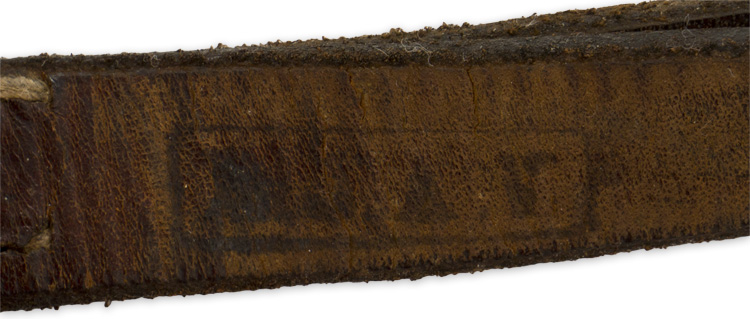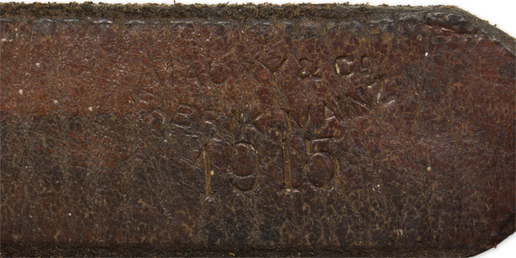 A single prong buckle leather strap that measures approximately 18mm x 43cm long that is embossed "1915" to one end along with a manufacture name. Leather remains strong, but has become partially dried.