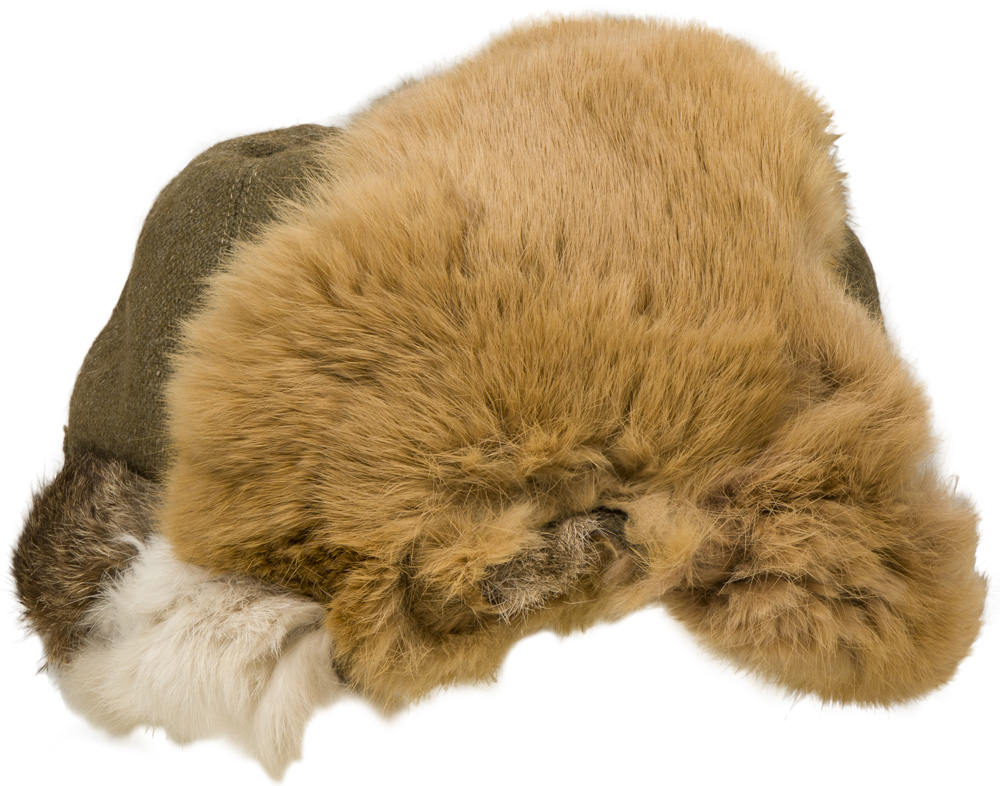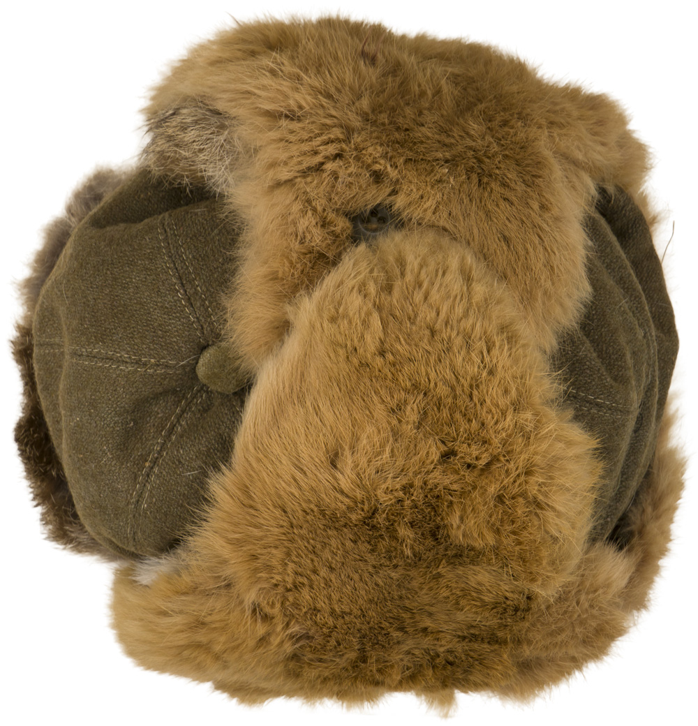 A standard pattern cap as issued to Japanese troops for cold weather conditions. Its exterior crown is comprised of six triangular sections of olive drab wool which meet at a wool-covered "button" to its apex. mall, "D"-shaped flaps of the same material are sewn along the seam to the base of the sections above each ear. Beneath these extend olive drab wool panels which cover the ears, are joined by another panel along the back of the neck, and could be fastened under the chin to the front. A circular hole for each ear is cut into each of these panels, which could be covered by the aforementioned small flaps. Each of the small flaps have rabbit fur lining their interiors and have olive drab loops to their outside edges. These loops mate with either the buttons sewn to each side of the crown, or the buttons sewn below each of the circular openings to the lower panels. A button is also sewn forward of each of the ear openings. A pair of ties are sewn to each side to the interior, with one being almost torn in half. The interior is lined in white cotton that bears an ink stamp. To the front of the cap, upon the olive drab wool base, the outline of the five pointed star can faintly be seen, as it has been removed. The wool is in good condition with typical wear and knapping, with the fur being in very good condition.