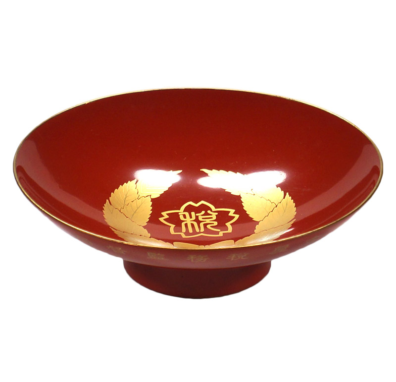 .A wood construction, red lacquer, gilt rimmed, sake cup with a painted wreath laurel and gilt kanji that has a raised bottom. Dated, "1936-37". The cup has a diameter of 10.5cm.