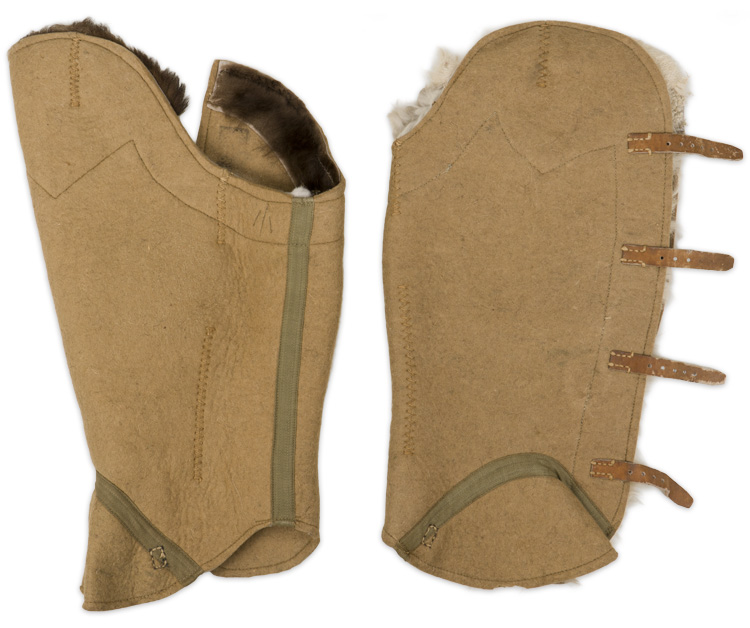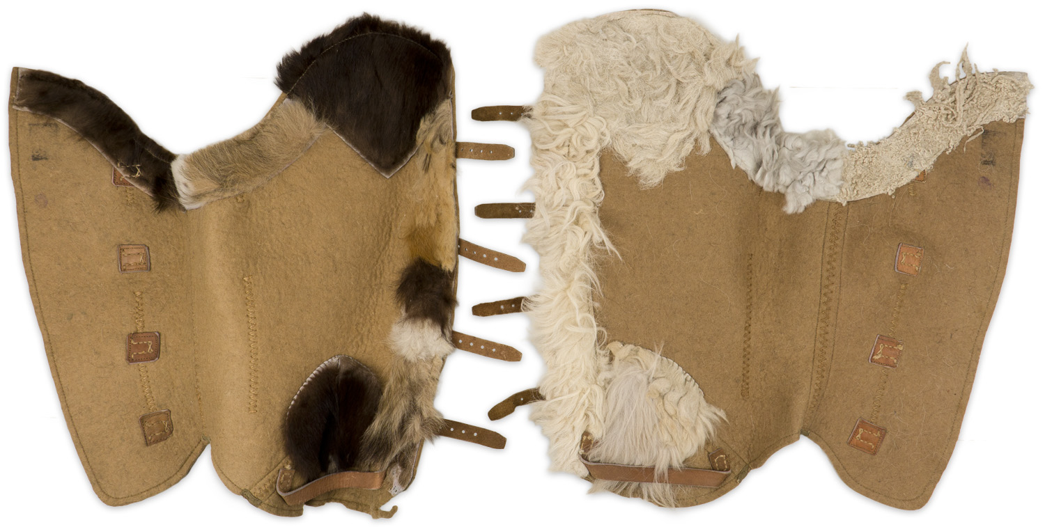 A pair of wool/felt, leather and fur lined leg wraps that measure approximately 44cm long. Each bears four leather straps that correspond with single prong roller buckles. Fur lines the tops of each panel, the strap sides and bottoms of the same panel. The surface shows some moth holes and general wear.