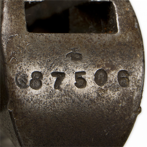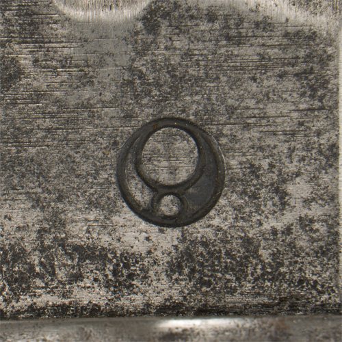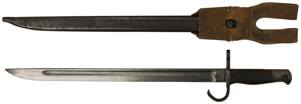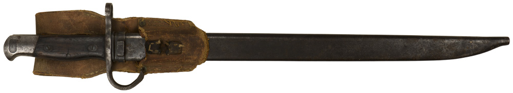 Type 30 bayonet and scabbard. Serial numbers and manufacturer’s stamps are evident to the head of the bird’s head pommel with a button release. The lightly age-darkened, contoured wraparound wooden grips are fixed with two screws. The blued, hooked contoured metal crossguard has a circular muzzle guide. The 40cm fullered bright blade. Second pattern sheet metal scabbard, with no-ball tip. The maker’s mark to the ricasso is that of the Nagoya Arsenal. Canvas frog is missing its buckle but otherwise decent.