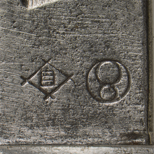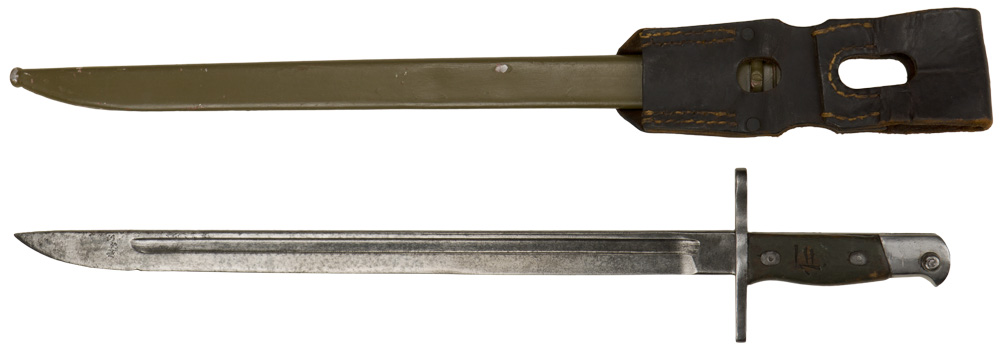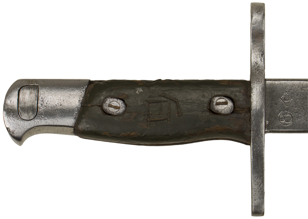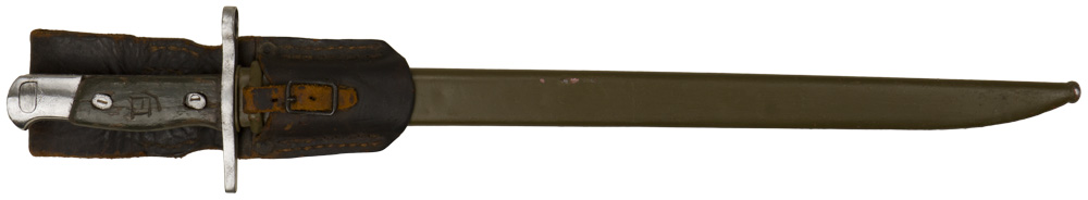 Type 30 bayonet and scabbard. Serial numbers and manufacturer's stamps are evident to the head of the bird's head pommel with a button release. The lightly age-darkened, contoured wraparound wooden grips are fixed with two screws. The straight contoured metal crossguard has a circular muzzle guide. The 40cm fullered blade. Second pattern sheet metal scabbard with paint. The maker’s mark to the ricasso is that of the Nagoya Arsenal.