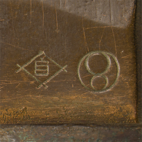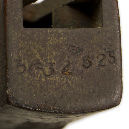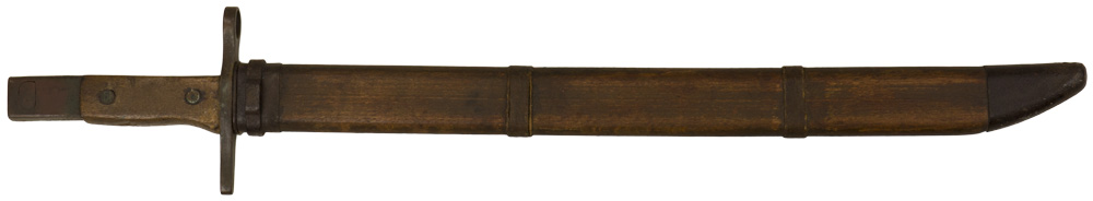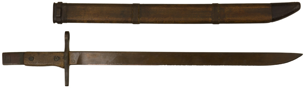 Late war bayonet woth wooden scabbard. Serial numbers and manufacturer’s stamps are evident to the head of the blued, rectangular pommel with a button release. The lightly age-darkened, flat-sided wooden grips with a contoured bottom are fixed with two rivets. The straight contoured metal crossguard has a circular muzzle guide. Roughly 15 3/4" un-fullered blade. The maker’s mark to the ricasso indicates that it was made by the Toyada Automatic Loom Works, a subcontractor of the Nagoya Arsenal.