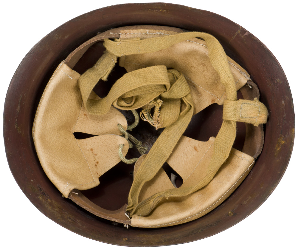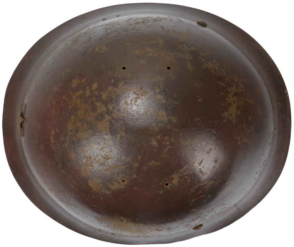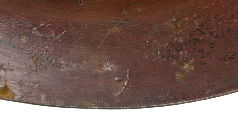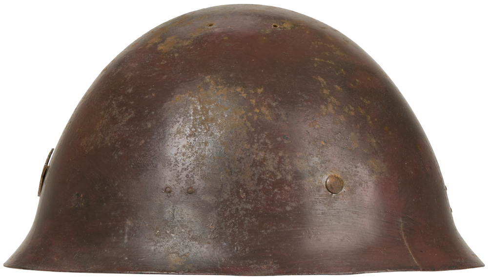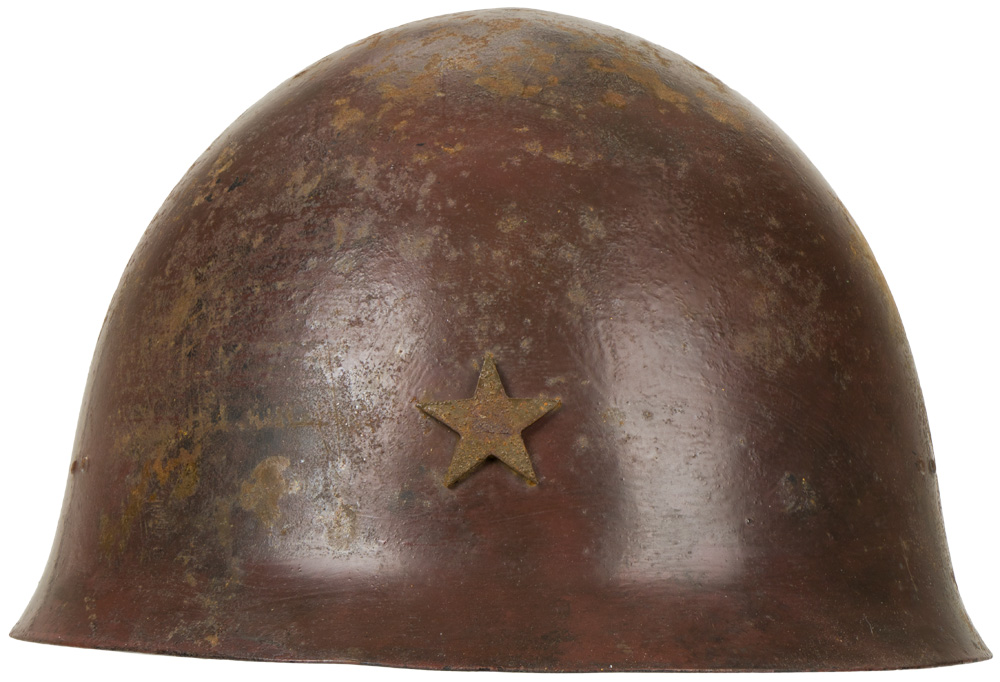 The standard WWII Japanese infantry combat helmet. The shell, constructed from chrome polybend steel retains a good portion of its original paint. The original IJA metal star affixed to the front. Helmet has a replaced, modern liner in it. Shell is really quite decent, it deserves to have an original liner put back in it!