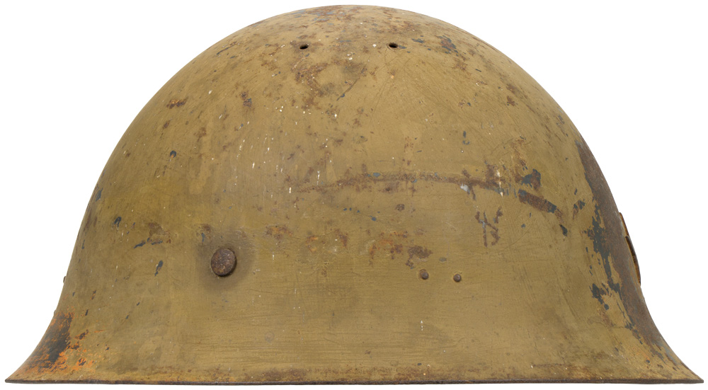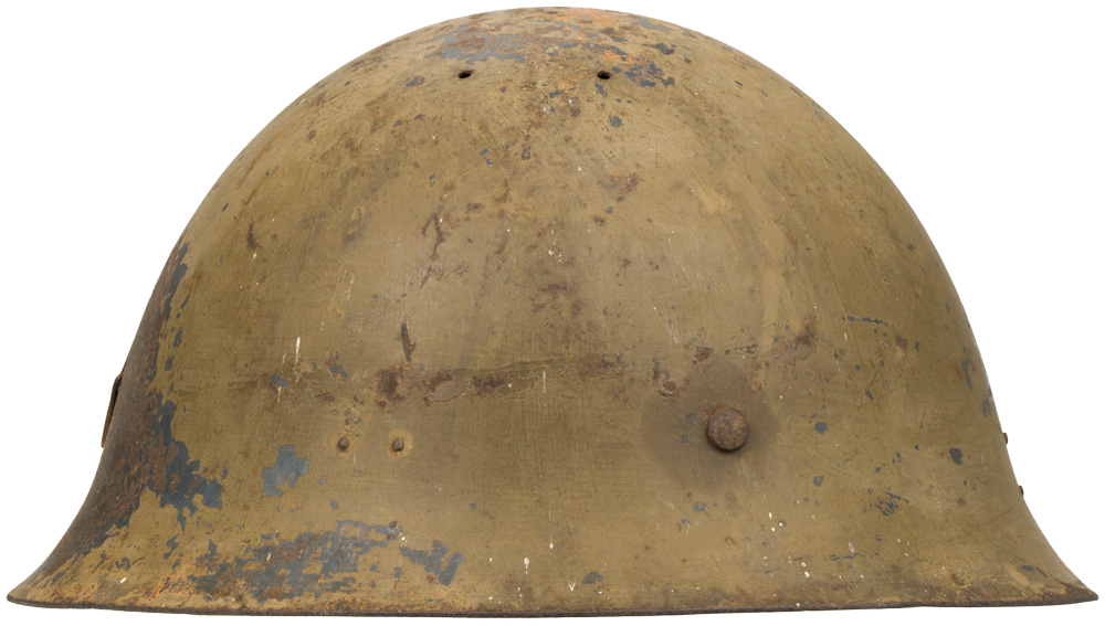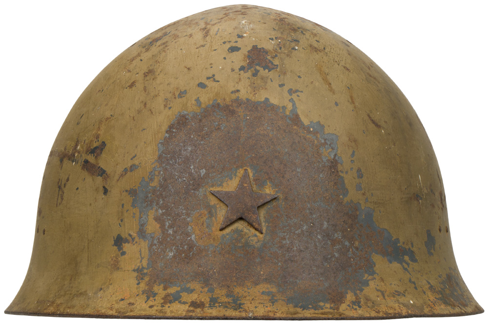 The standard WWII Japanese infantry combat helmet. The shell, constructed from chrome polybend steel retains a good portion of its original paint. The original IJA metal star affixed to the front. The original three pad pigskin liner and band is complete. The helmet is complete with its original cloth chinstrap and all rivets and rings. Well worn and used example.
