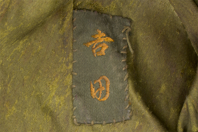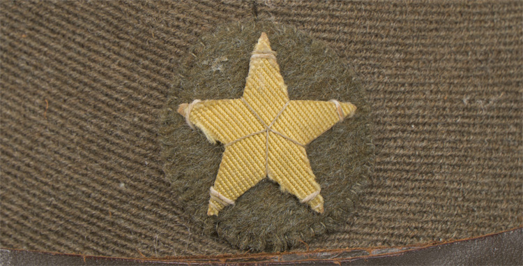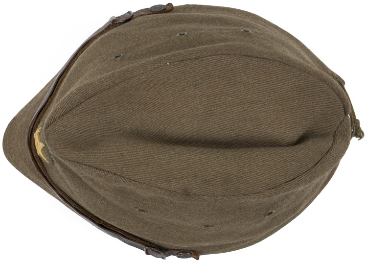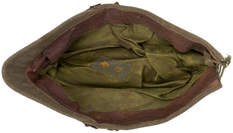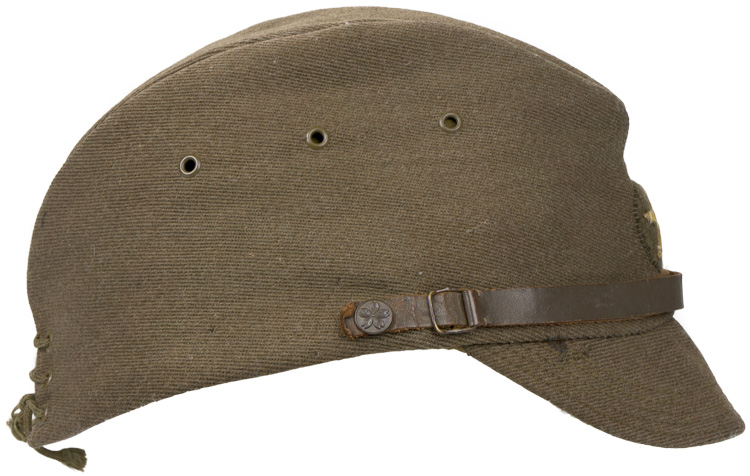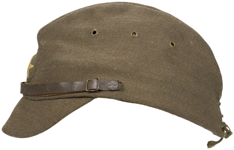 Fine grade cloth construction, khaki colored field cap used by the Japanese army until the end of the war. Above its stiffened, short visor, made of the same material as the body, is sewn a patch, in olive drab, upon which is a yellow wool five pointed star. Small brass buttons, each with a five lobed cherry blossom embossed to them secure the original chinstrap. Three metal ventilation grommets are to each side of the cap. Three grommets are to either side of the vertical slash to the reverse of the cap; the six bound together by an adjustable tie string. The interior is lined in cotton with a brown leather sweatband. Original owners name tag is present. Nice clean example.