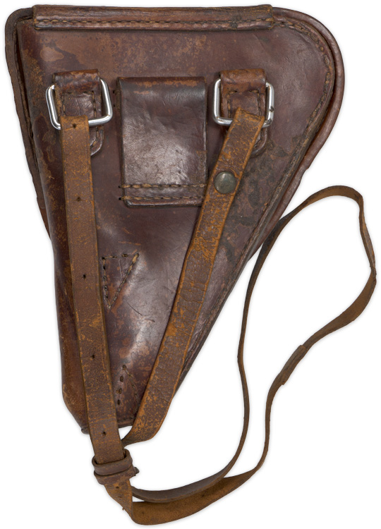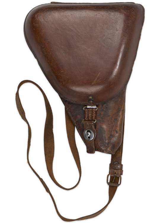Early reddish brown, leather, hard shell holster for the type 14. 8mm Nambu pistol. The hard shell fold over flap is attached to its top by a sewn leather hinge. Original shoulder strap. All complete and in nice condition.