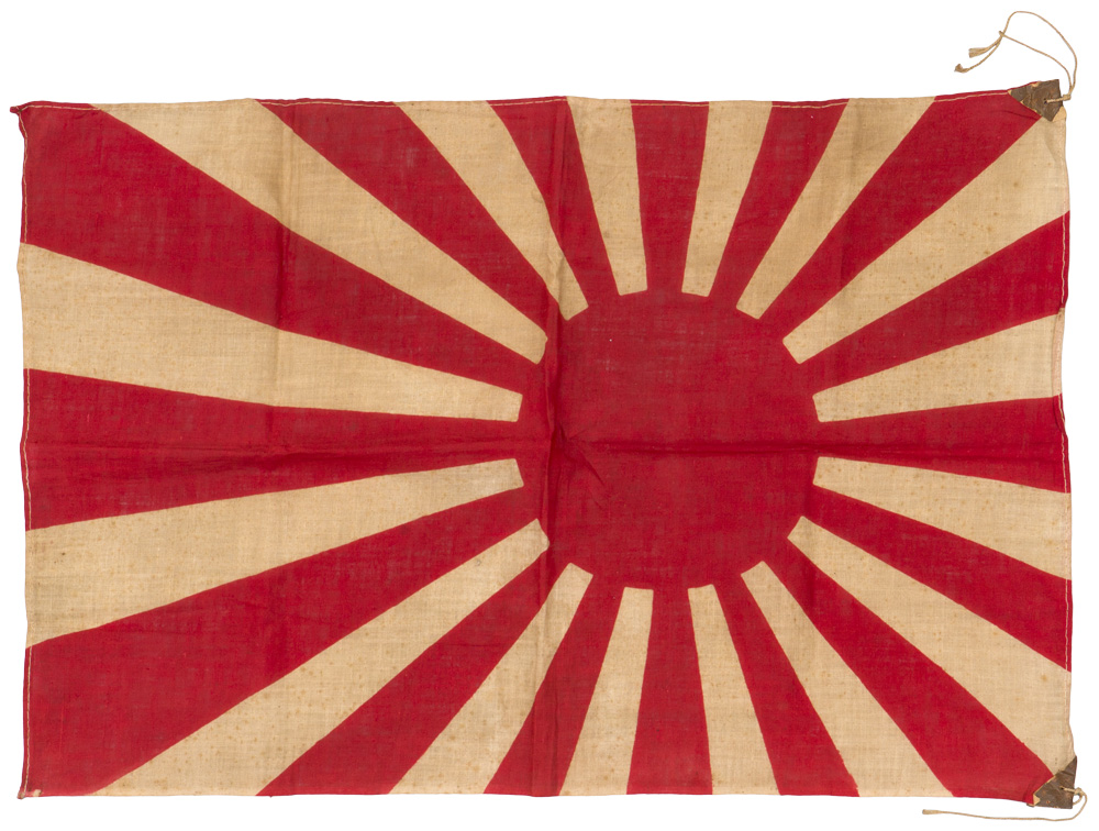 Smaller size, approximately 50cm x 35cm, one piece white cotton flag, upon which is printed, in red, a "Rising Sun" comprised of sixteen rays emanating from its central "Hinomaru". Original corners and tie strings are still present. Shows age, use and period wear, but overall nice condition.