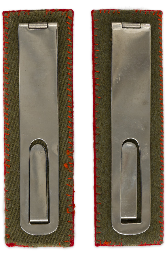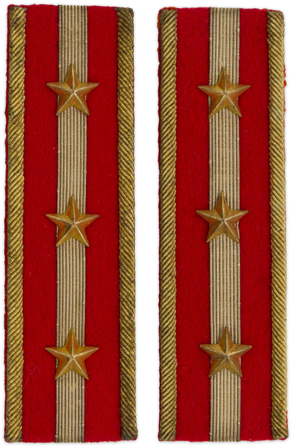 The "Type 5" (5th year of the Showa era, or, 1930) rank insignia were worn on the shoulders of the uniform, as that model’s stand up collar featured the arm of service colors and regimental numerals. Red wool tab with gold tress, twisted bullion trim and