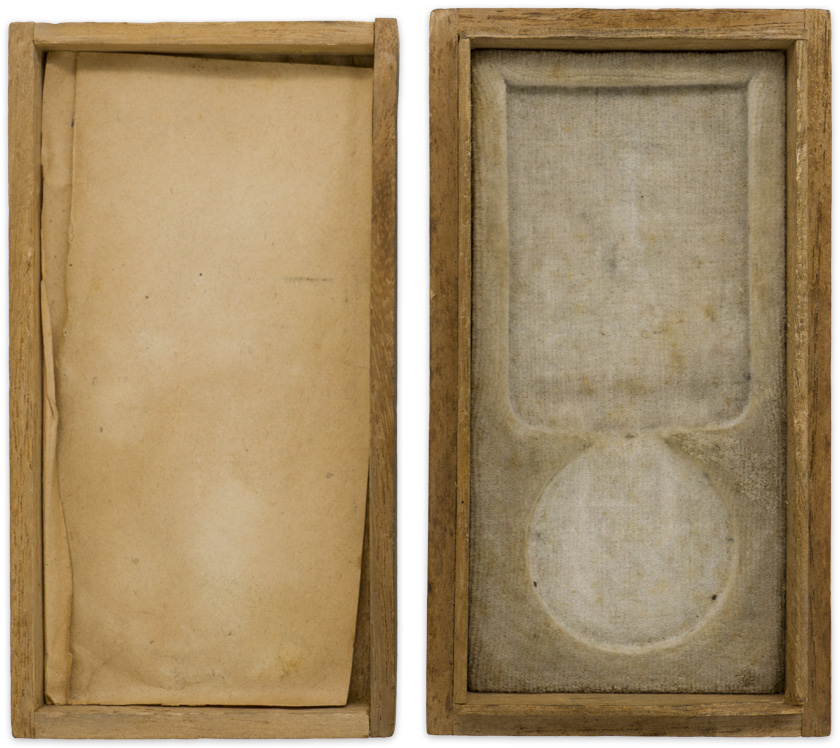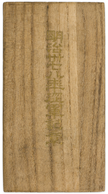 An approximately 6cm x 10.5cm softwood example. The case, which separates along its sides, has a vertical series of eight kanji characters, stamped in gold, to its cover. The base of the interior is lined in a red velvet like material and is molded to accommodate the medal and its ribbon.