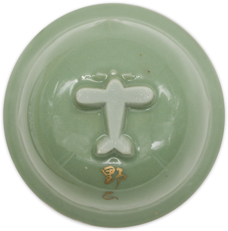 A celadon porcelain construction sake cup with gilt rim. The cup has a 55mm diameter.