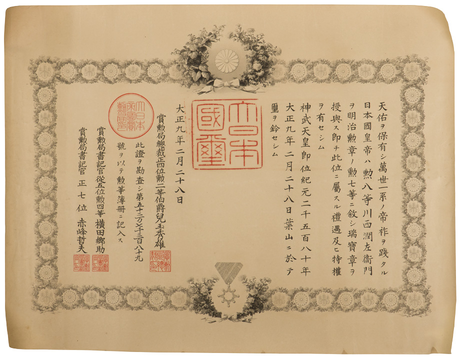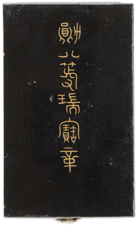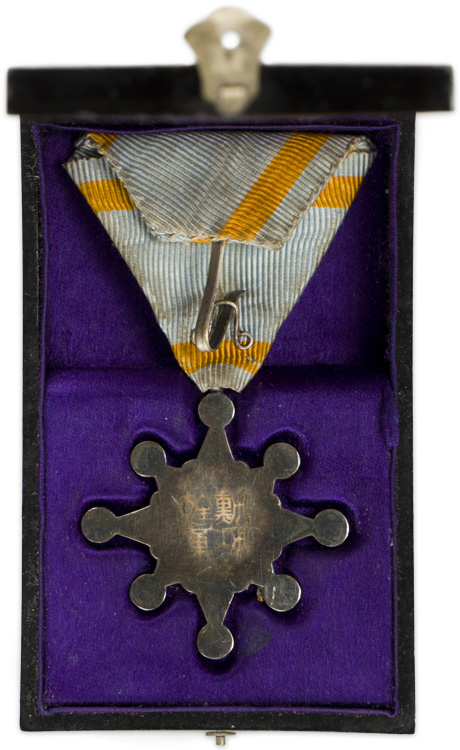 The Order of the Sacred Treasure ("Zuihosho"), established in January of 1888, was awarded to either military or civilian personnel for long service with good conduct. It came in eight classes, of which the lowest two could be given to enlisted personnel. The die-struck silver medal takes the form of an eight-pointed star whose points terminate in small circles, with even smaller circles marking the intersections of the edge lines, forming a stylized necklace. To the center is a raised, silver "mirror" against a pebbled background. These are the "sacred treasures" from which the award takes its name: the "Yata" mirror, representing purity and wisdom, and the "Yasakani" jewels, which represent benevolence, obedience and affection. Its otherwise featureless reverse has four kanji characters impressed to it, translating to "Order of Merit decoration." A perforated ball is to the top of the medal’s uppermost point, through which passes the ribbon’s suspension ring. Fed unto the ring is a 1 7/16" wide, watered ribbon, in light grey (establishing it as an older award as later examples are in light blue), which has a 1/8" wide, vertical orange stripe 1/8" in from either edge. The ribbon is folded in a triangular fashion, and it has an elongated, vertical alloy hook is to its top, which folds down and mates with an alloy eye sewn near the base of its reverse. Light age soiling is evident to the ribbon, and verdigris may be seen to the medal’s obverse, pebbled background. They are nested into corresponding depressions to the purple silk covered interior base of its original presentation case, whose interior lid is also lined in padded, purple silk. The silk exhibits only light age and usage soiling. The exterior of the 2 3/16" x 3 5/8" x 13/16", black lacquered wooden case has a wide alloy hinge along its rear edge, and a hinged alloy closure device and corresponding stud to its forward edge. A column of kanji characters is painted, in gold, to its cover, which includes the number "8." The exterior of the case exhibits light surface scratching and edge wear. Accompanying the cased award is its original, 23 1/4" x 17 7/8" paper award document, which has a decorative floral border punctuated by alternating Chrysanthemums and Paulownia leaves and flowers printed to it, with an enlarged, sixteen-petaled Imperial Chrysanthemum, within a wreath of the same, breaking the top center of the border, and an image of the eighth class award itself, within a similar wreath, breaks the bottom center. The Imperial seal, in red and within a square, is beneath the Imperial Chrysanthemum. Eight columns of kanji characters are printed to the right of the document, and six to the left, with the sixth column from the right indicating that the award was bestowed during the 2580th year of the empire, or more specifically, as is indicated to both the seventh and ninth columns from the right, "Taisho era, ninth year, second month, twenty-eighth day," or, 28th February, 1920. The Bureau of Merit and Award seal, in red and within a circle, is to the upper left, beneath which is the name, title and red seal of the Director General (column ten from the right), the registry number 527389 on the roster of merits (column eleven), and then the names, titles and red seals of the secretaries (columns thirteen and fourteen). Hand written, in pencil and in English, along the upper left edge of the reverse of the document is the name of the award, the recipient and the aforementioned date. The paper is typically, lightly age yellowed and soiled, but has no tears, significant creasing or edge wear.