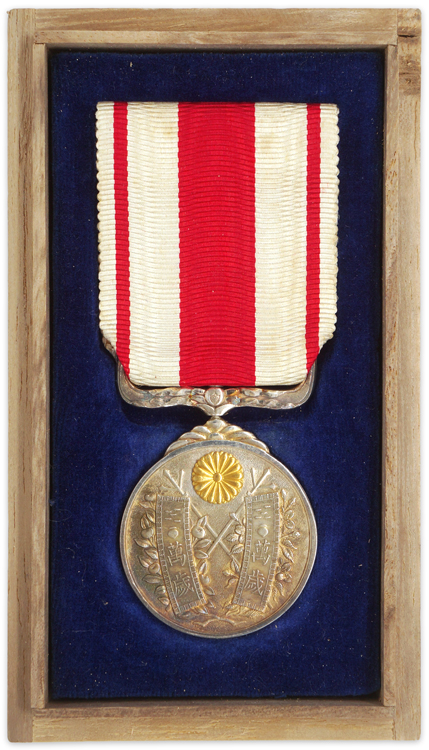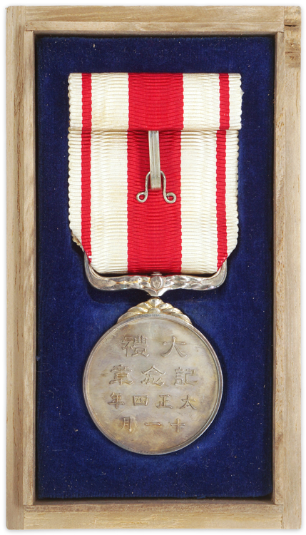 The Taisho Enthronement Commemorative Medal was instituted on August 13, 1915 and awarded to those who participated in the celebration ceremonies. Silver with a gilt chrysanthemum, measuring 30.5 mm in diameter. Original ribbon with hook and eye. Original wooden case.
