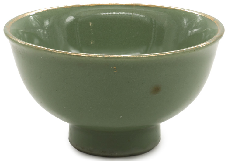 A celadon porcelain construction sake cup with gilt rim. The cup has a 55mm diameter.