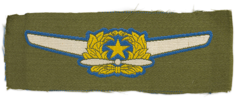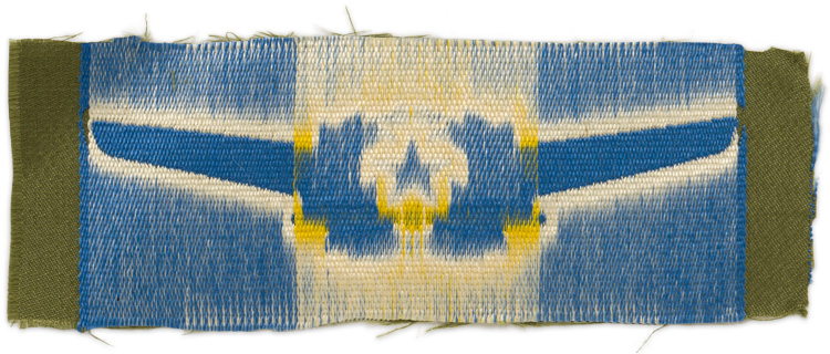 Flight service wings, introduced in October 1943 for all flying personnel serving with the IJA Air Service, machine woven to an approximately 10.5cm x 4cm section of olive drab rayon. The insignia is comprised of stylized, silver-white wings, 8.3cm from tip to tip, to either side of a golden-yellow wreath of laurels, which encloses a golden-yellow, five pointed star, beneath which is a silver-white, horizontal propeller, all outlined and against a medium blue base. The edges are roughly cut and lightly frayed, but the unissued insignia itself is still very clean and bright. Still on original factory roll material.