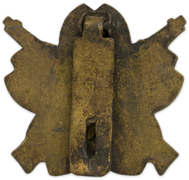 The alloy badge takes the form of a convex, five-petal cherry blossom, 36mm from the end of one petal to another, with crossed rifles upon it. The rifles and the petals are in gold (tarnished/faded), while the borders of the petals, are in gold gilt. A hinge with a broad, flat pin, whose perforated end mates with an "eye," is to its reverse.